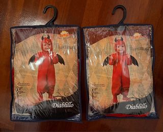 2 Disfraces de diablillo para bebé, ideal para fiestas o Halloween. Talla 6-12 meses. Cada uno incluye: - Mono entero - Capucha con cuernos - Alas negras También tengo más disfraces en mi armario por si te interesa ahorrar en gastos de envío.