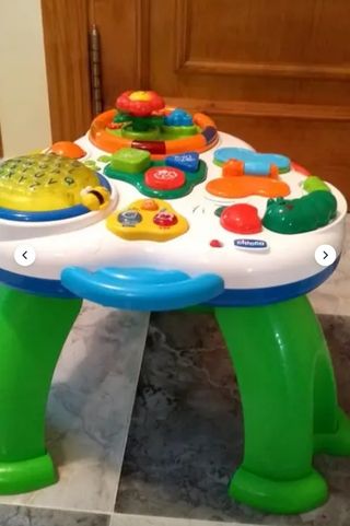 mesa parlanchina con múltiples actividades que ayudan al niño a familiarizarse con las palabras en español y en inglés tiene dos modalidades de uso: 1.aprendizaje;el niño descubre el abecedario, las formas, los numeros, los contrarios... debido a las canciones que riman y a los simpáticos personajes. 2.musica; el niño juega con melodías,efectos sonoros y canciones. las luces alegres que se encienden según la actividad le sirven de estímulo para concentrarse. las patas extraíbles se pueden quitar para usar el juego en el suelo.