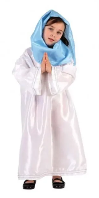 Disfraz de la Virgen María para niña de 3 a 4 años. Incluye túnica blanca y velo azul. - Túnica blanca satinada con detalles plateados en puños y bajo. - Velo azul para la cabeza. - Talla: 3-4 años.