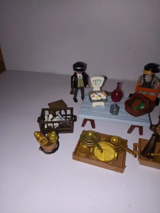 Lote de tres figuras de Playmobil. - Figura de mago con capa negra y bastón. - Figura de diablo con tridente y cuernos. - Figura de vampiro con copa.