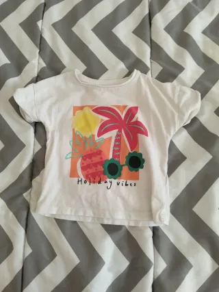 Camiseta blanca para bebé con estampado veraniego. - Diseño Holiday Vibes con palmera, piña y gafas de sol. - Estampado a todo color. - Manga corta.