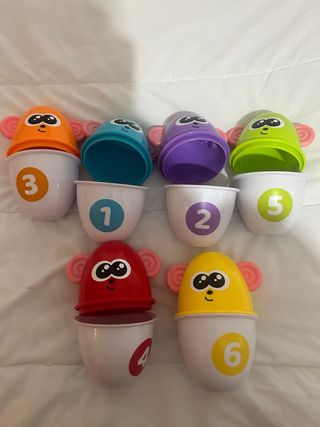 Conjunto de juguetes apilables con diseño de monos y números. - Incluye 7 piezas. - Colores: naranja, azul, morado, verde, rojo, amarillo y blanco. - Cada pieza tiene un número del 1 al 6, con una pieza adicional sin número. - Orejas rosadas en cada mono.