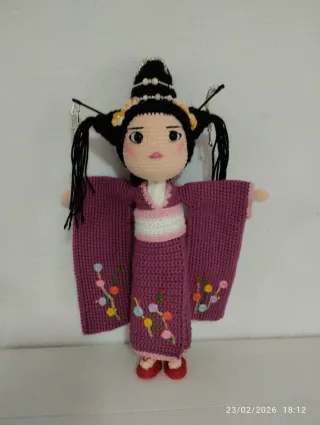 Preciosa muñeca amigurumi hecha a mano, inspirada en la vestimenta tradicional japonesa. - Tejido de ganchillo con la técnica del Amigurumi. - Detalles bordados de flores en el kimono. - Adornos en el peinado. - Mide unos 32 cm.