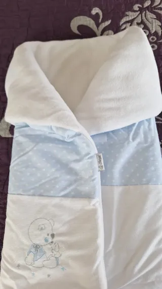 Saco para capazo de bebé con un tierno diseño. Estado como nuevo. Muy poco uso. - Tejido exterior blanco con bordado de oso. - Parte central azul con estampado de estrellas blancas. - Forro interior blanco suave. - marca D'Peques
