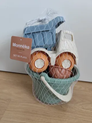 Set de playa de la marca Monneka. En su embalaje original. Incluye cubo, pala, rastrillo, camión, regadera y varios moldes para figuras de arena.