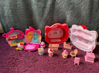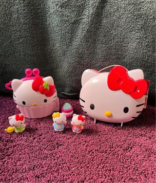Adorable set de Hello Kitty que incluye un maletín y varias figuras. - Maletín con diseño de Hello Kitty y lazo. - Figuras de Hello Kitty con diferentes atuendos. - Incluye accesorios pequeños como una regadera y un vaso.