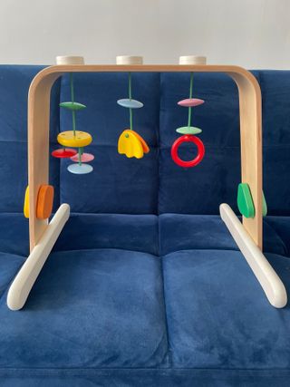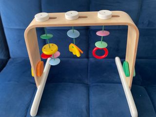Gimnasio de madera para bebés con juguetes colgantes. - Estructura de madera natural. - Juguetes de colores: discos, aro y figura. - Diseño seguro y estimulante.