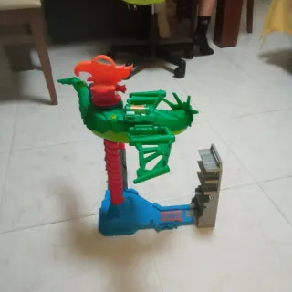 Pista de Hot Wheels con temática de dragón. - Incluye un dragón verde y naranja. - Base azul y rampa gris.