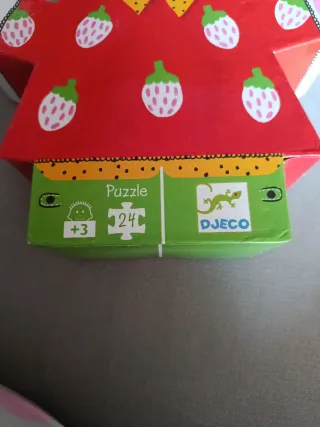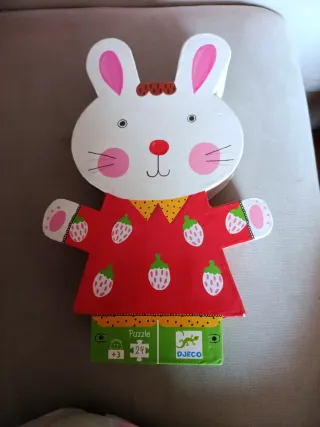 Divertido puzzle de la marca Djeco con un simpático conejito vestido con un traje de fresas. - 24 piezas. - A partir de 3 años. - Diseño colorido y atractivo.