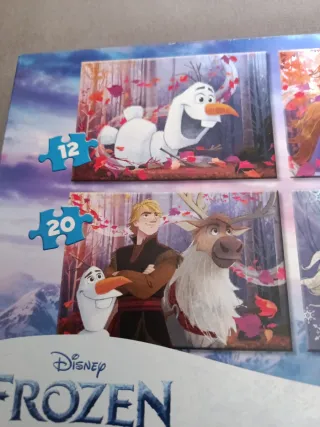Set de 4 puzzles de Disney Frozen con diferentes cantidades de piezas para distintos niveles de dificultad. Ideal para fans de la película. - Incluye 4 puzzles con imágenes de los personajes de Frozen. - Piezas de 12, 16, 20 y 24 unidades. - Diseños basados en la película Frozen.