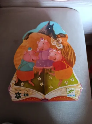 Divertido puzzle de la marca Djeco con la historia de los tres cerditos y el lobo. - 24 piezas. - A partir de 3 años. - Ilustración colorida y detallada.