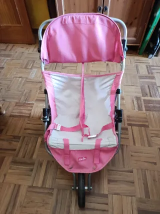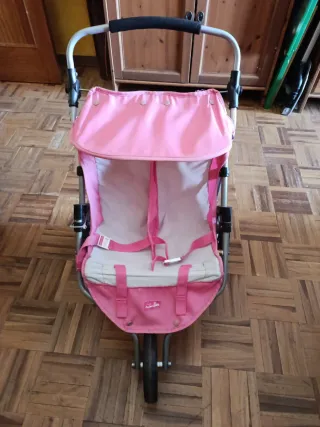 Carro gemelar de juguete en color rosa, perfecto para que los más pequeños jueguen a pasear a sus muñecos. - Estructura metálica. - Asientos acolchados. - Arnés de seguridad. Se puede cerrar y guardar. Es muy comodo de llevar. No sé realizan envíos. Solo Venta en persona.