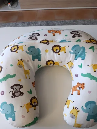 Cojín de lactancia con un divertido estampado de animales de la selva. - Diseño con leones, elefantes, tigres, monos y jirafas. - Colores vivos y alegres. - Forma ergonómica para mayor comodidad.
