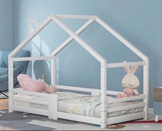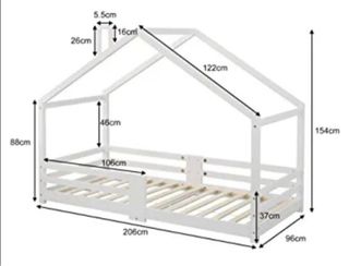 Cama estilo Montessori con diseño de casita, ideal para habitaciones infantiles. Fabricada en madera blanca. - Medidas exteriores: 206cm (largo) x 96cm (ancho) x 154cm (alto). - Altura del somier al suelo: 37cm. - Altura de la barandilla: 26cm. - Medidas interiores de la cama: 106cm (largo) x 46cm (ancho). - Medida de la viga del tejado: 122cm. - Grosor de la madera: 5.5cm y 16cm. precio original 459€ de la marca Bainba.