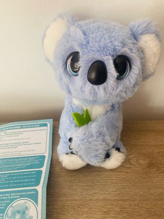 Este koala interactivo es un compañero adorable y tierno. Suave al tacto y con grandes ojos expresivos, está listo para jugar. ¿Qué hace este Koala? • Es súper cariñoso: Sus patas se mueven para agarrarse a tu brazo y darte abrazos de verdad. • Reacciona al tacto: Tiene sensores que hacen que responda cuando lo acaricias o le haces cosquillas. • ¡Hace sonidos!: Emite más de 50 sonidos diferentes (ríe, come, suspira) y sus mejillas se iluminan cuando está feliz. • Set Completo: Incluye su hoja de eucalipto original para darle de comer y el manual de instrucciones.