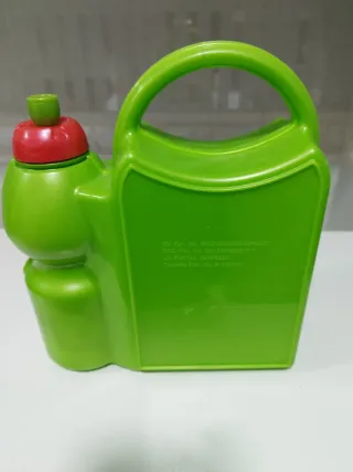 Porta merienda de plástico en color verde con la imagen de Mickey mouse tanto en la botella como en la tapa Cierre hermetico