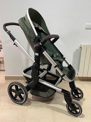 Cochecito Joolz Day en color verde, ideal para paseos cómodos. - Chasis plateado. - Manillar y barra frontal en polipiel marrón. - Capota extensible. - Cesta de compras. - Ruedas delanteras giratorias y traseras grandes.