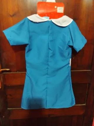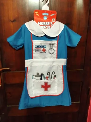 Disfraz de enfermera para niñas, ideal para juegos de rol o fiestas. - Incluye vestido azul con delantal blanco. - Estampado de accesorios médicos en el delantal. - Cuello blanco. - Talla para 5-7 años.
