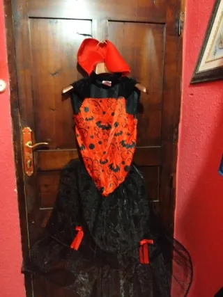 Disfraz de vampiresa para niña, adecuado para edades de 10 a 14 años. Incluye un vestido con detalles rojos y negros, y un sombrero. - Diseño con murciélagos y volantes. - Talla para niñas de 10 a 14 años. - Incluye sombrero a juego.