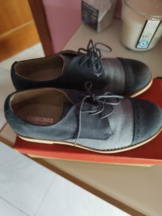 Elegantes zapatos de vestir para niño, perfectos para celebraciones o eventos especiales. Puestos una vez - Color azul - Cierre de cordones. - Detalle de picado en la puntera. - Marca CHUCHES. - Talla 33