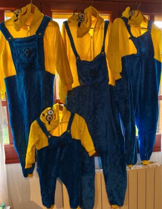 Pack de disfraces de Minions para toda la familia. Incluye varios tamaños. Solo me quedan Mama talla M 20€ Bebe 4 años 10€ - Disfraces completos de Minion. - Diseño con peto azul y camiseta amarilla. - Capuchas con detalles de los ojos de Minion.