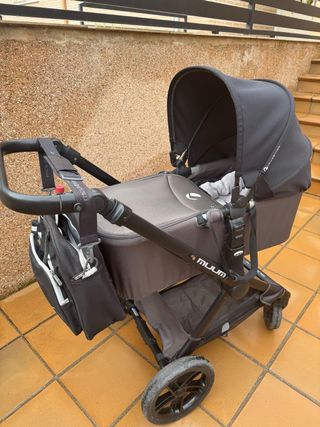 Carro de bebé Muum de Jané en color gris y negro, compuesto por 3 piezas. - Chasis ligero y plegable. - Silla de paseo reversible. - Capazo. - Silla de coche Grupo 0+. Se regala saco de invierno y plastico nuevo para lluvia