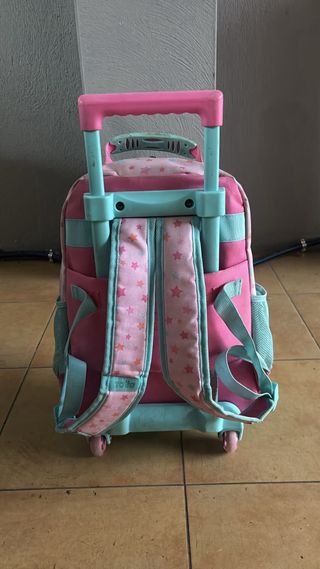 Mochila Totto con ruedas, ideal para niñas. Su diseño es en color rosa con detalles en turquesa y un divertido estampado. - Ruedas para facilitar el transporte. - Asa extensible. - Compartimento principal amplio. - Bolsillos laterales de malla.