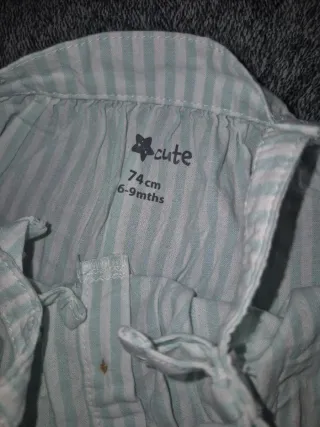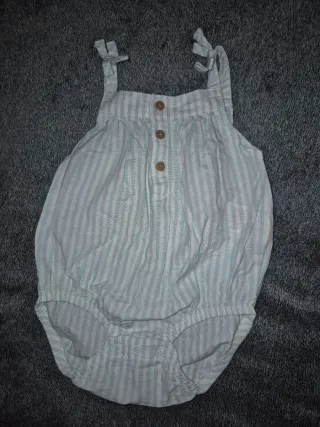 Body de bebé con un diseño de rayas verticales en tonos verde menta y blanco. Es una prenda cómoda y fresca. - Cierre de botones en la parte delantera. - Tirantes con lazada. - Broches a presión en la entrepierna.
