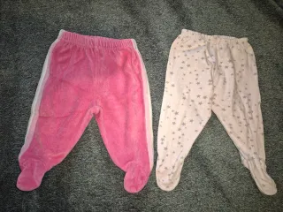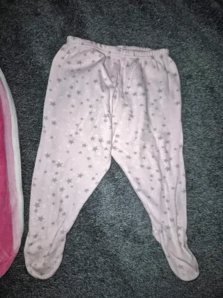 Conjunto de dos pantalones para bebé niña, perfectos para el día a día. - Pantalón rosa de terciopelo con detalles de rayas blancas y rosas. - Pantalón rosa pálido con estampado de estrellas grises.