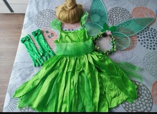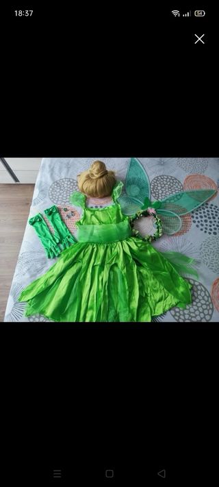 Disfraz de Campanilla para niñas de 6 a 7 años. Incluye vestido, alas, corona y guantes. - Vestido verde brillante. - Alas de hada translúcidas. - Corona de flores. - Guantes verdes.