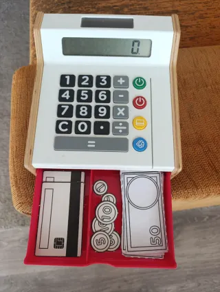 Caja registradora de Ikea con un diseño moderno y funcional. - Pantalla digital. - Teclado numérico y de operaciones. - Botones de encendido y apagado.