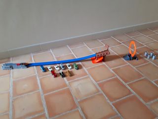 Es un set de pista básico que permite a los niños realizar acrobacias y saltos con sus coches de juguete. El set incluye una rampa de lanzamiento accionada por un mecanismo de goma para impulsar los coches, 1 aro de fuego, una rampa extra, obstáculos barriles y 10 coches Hot Wheels diferentes elige tu favorito