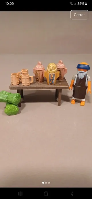 Figura de Playmobil que representa a un mercader, ideal para coleccionistas o para añadir a escenarios. - Incluye mesa con jarras y anforas - Accesorios de heno. - Figura con delantal y gorro.