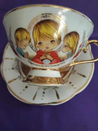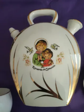Jarra decorativa para recuerdo de Primera Comunión. Presenta una ilustración de dos niños rezando, rodeados de palomas y flores. - Diseño con detalles dorados. - plato y taza con detalles dorados - copa igualmente
