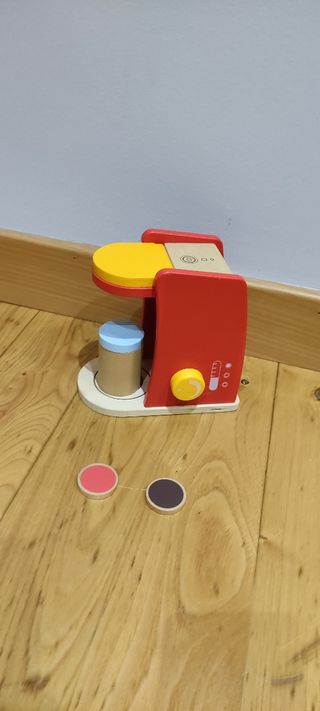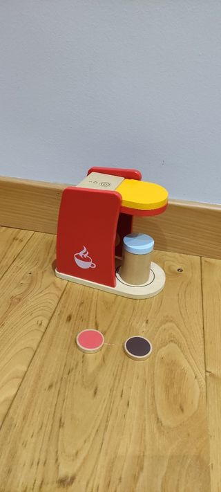 Se vende cafetera de juguete, compuesta por dos cápsulas y una especie de jarra, todo ello de madera