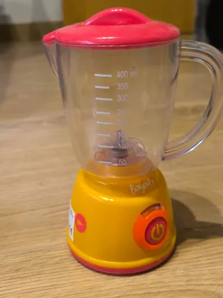 Batidora infantil de juguete con diseño divertido y sonido. - Base de color amarillo con detalles en rosa y naranja. - Jarra transparente con medidas. - Tapa roja. - Botón de encendido con símbolo. En perfecto estado, se vende por falta de uso. Solo pretendo darle una segunda vida y evitar el consumismo.