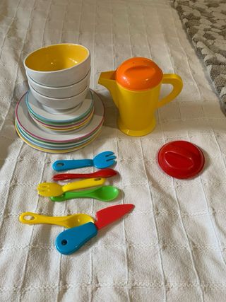 Set de vajilla de juguete para niños, ideal para juegos de imitación. Incluye varios platos, cuencos y utensilios. - Tres cuencos de colores: amarillo, azul y rosa. - Cuatro platos apilables con bordes de colores. - Cuatro platos de postre con bordes de colores. - Juego de cubiertos de plástico tenedor azul, tenedor amarillo, cuchara verde, cuchara roja y cuchillo rojo. - Jarra de agua amarilla con tapa naranja. - Tapa roja adicional.