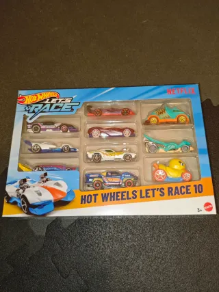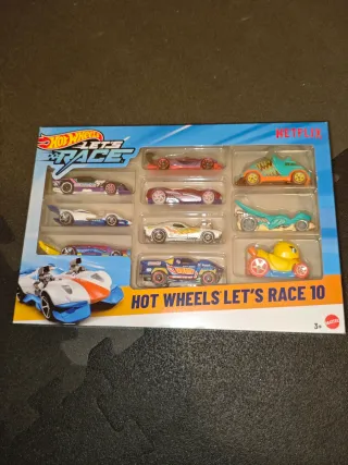 Pack de 10 coches de juguete Hot Wheels de la colección Let's Race de Netflix. Ideal para coleccionistas y fans de las carreras. Gt scorcher etc - Incluye 10 vehículos. - Diseño inspirado en la serie. - Marca: Hot Wheels.