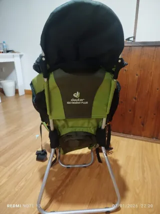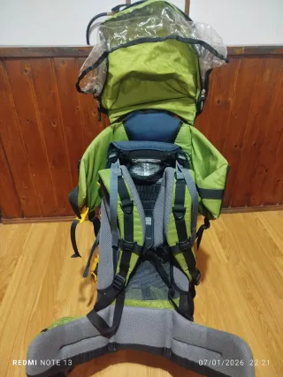 Mochila ergonómica para llevar a bebés en excursiones de montaña. Diseñada para la comodidad del porteador y del niño. - Cinturón lumbar acolchado. - Tirantes ajustables. - Capota protectora. - Bolsillos de almacenamiento.