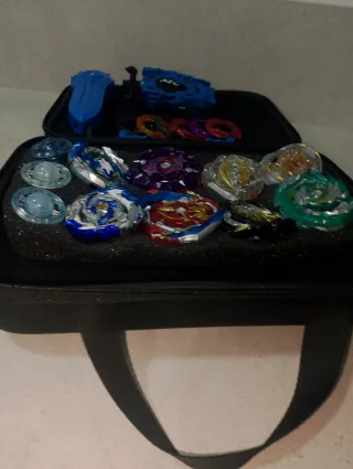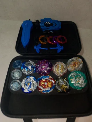 Set de peonzas de edición limitada, ideal para coleccionistas y aficionados. Incluye accesorios para el juego. - Variedad de peonzas con diseños únicos. - Lanzadores y otros componentes incluidos. - Estuche de almacenamiento negro. -PRECIO NEGOCIABLE.