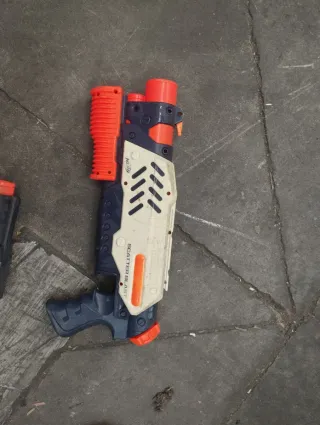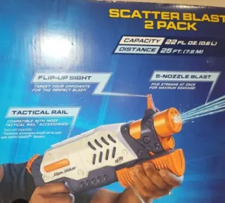 Esta es una Nerf Super Soaker Scatter Blast, una de las pistolas de agua más icónicas y resistentes de la línea Super Soaker de Hasbro. Aquí tienes los detalles principales sobre sus funciones y su valor actual: Descripción y Características Acción de Disparo: Funciona mediante bombeo manual (no necesita pilas). Al mover la empuñadura naranja delantera hacia adelante y atrás, lanzas el agua. Modo de Chorro: Su característica principal es que tiene 5 boquillas en el cañón, lo que permite lanzar 5 chorros de agua simultáneamente, creando un efecto de "escopeta" que cubre un área más amplia. Alcance: distancia 10 metros