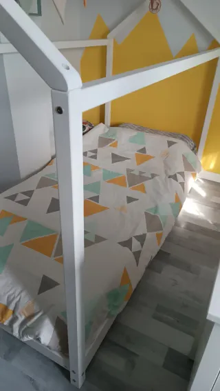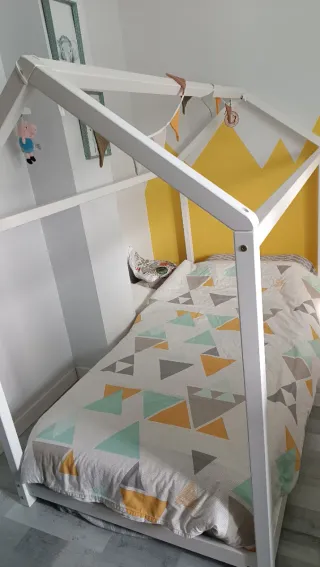 Cama estilo Montessori con diseño de casita, ideal para habitaciones infantiles. Su estructura abierta fomenta la autonomía. - Estructura de madera blanca. - Diseño de casita. - Colchón no incluido. - Pequeña raja en un lateral que no llega estar completa ni traspasar al otro lado, es más bien una pequeña grieta de la propia madera, aún así lo he reforzado con una placa de anclaje. -Signos de uso, de ahí su precio. -Para colchón de 190 x 90cms