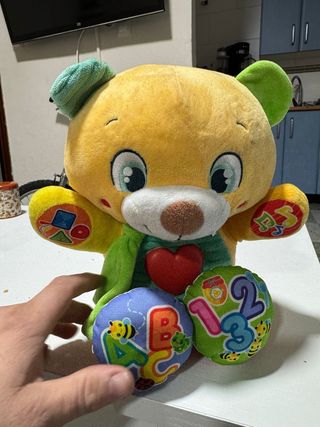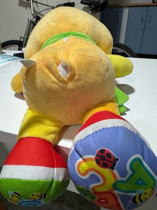 Osito de peluche interactivo con actividades. - Diseño de oso amarillo con detalles en verde y rojo. - Incluye elementos de aprendizaje como letras y números. - Texturas suaves y colores llamativos.