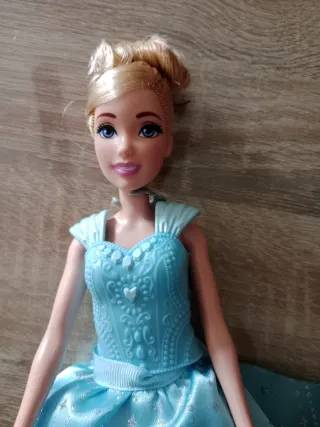 Muñeca de la Princesa Disney, inspirada en un personaje clásico. - Vestido azul brillante. - Detalles plateados en la falda. - Peinado recogido rubio.