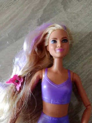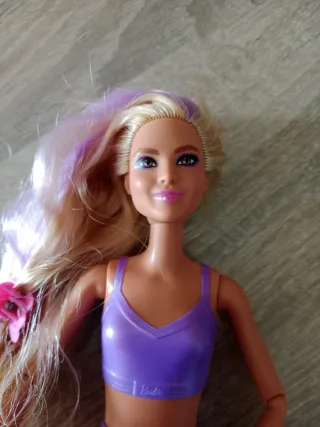 Muñeca Barbie con cabello largo rubio y mechas moradas. - Incluye un accesorio de flor rosa en el cabello. - Lleva un conjunto deportivo morado. - Marca Barbie.