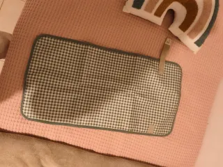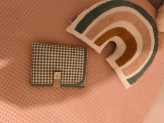 Cambiador portátil para bebé de la marca WalkingMum. Es práctico y fácil de llevar a cualquier parte. - Diseño a cuadros verdes y blancos. - Ribete verde. - Etiqueta de la marca.