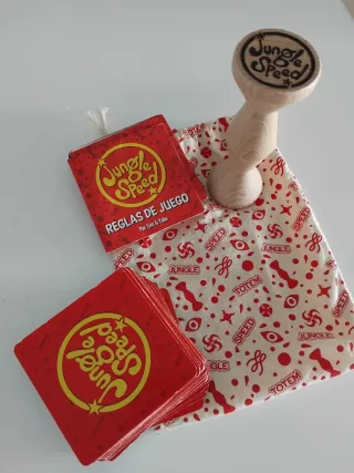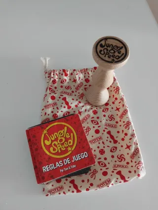 Juego de mesa Jungle Speed con su bolsa y reglas. - Incluye el tótem de madera. - Bolsa de tela con estampado. - Libro de reglas 'Reglas de Juego'.