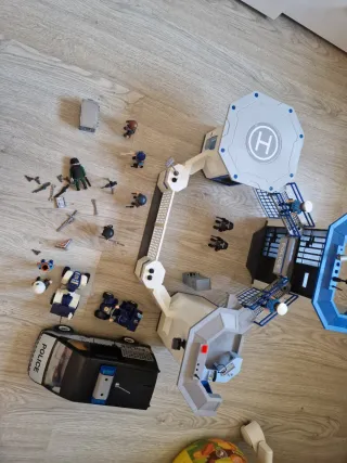 Lote de comisaría y coche de policía de Playmobil. Incluye figuras y accesorios. Todo lo de la foto, usado y faltan piezas. - Comisaría con helipuerto. - Coche de policía. - Figuras de policías. - Accesorios variados. police, lego, coleccion, juguetes, furgon...