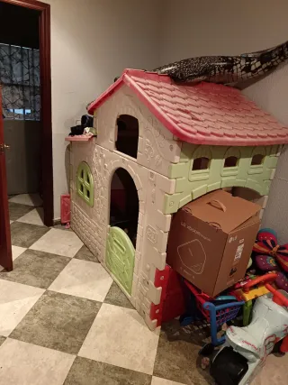 Casa de juguete de plástico para niños, ideal para jugar en interiores o exteriores. Su diseño colorido y resistente la hace perfecta para horas de diversión. - Estructura de plástico duradero. - Techo rosa y paredes en tonos pastel. - Puerta y ventanas decorativas.