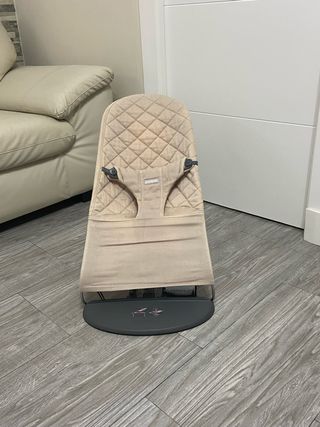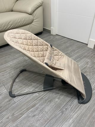 Hamaca para bebés de la marca BabyBjörn en color beige. Es cómoda y segura para los más pequeños. Habría que comprarle una funda nueva, esta algo descolorida. - Tejido acolchado. - Arnés de seguridad. - Base gris. - Diseño ergonómico.